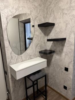 Ванная комната выполнена в современном стиле с качественной сантехникой. Из мебели — вместительные шкафы и удобный диван. В прихожей предусмотрены удобные полки для хранения вещей.