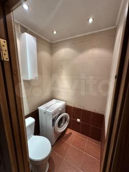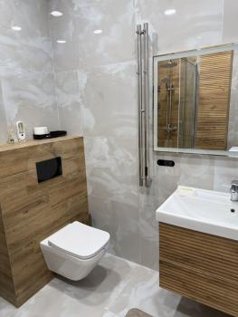 Полноценная ванная комната оснащена стиральной машиной, электрическим полотенцесушителем, а также имеется навесной шкаф со встроенной розеткой и подвесная тумба с раковиной. В туалете современная инсталляция, подвесной шкаф для различных принадлежностей.