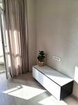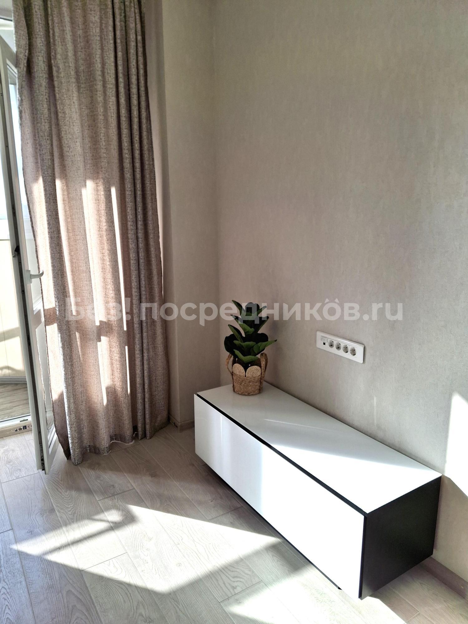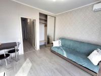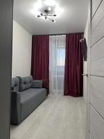 В студии свежий ремонт, выполненный в светлых тонах. С балкона открывается шикарный панорамный вид на город и коттеджный поселок. При этом окна не выходят на проезжую часть. С балкона можно любоваться красивейшими закатами.