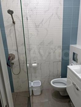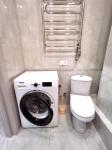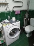 Санузел совмещенный, с душевой кабиной и стиральной машиной. Из мебели есть удобный диван и обеденный стол.