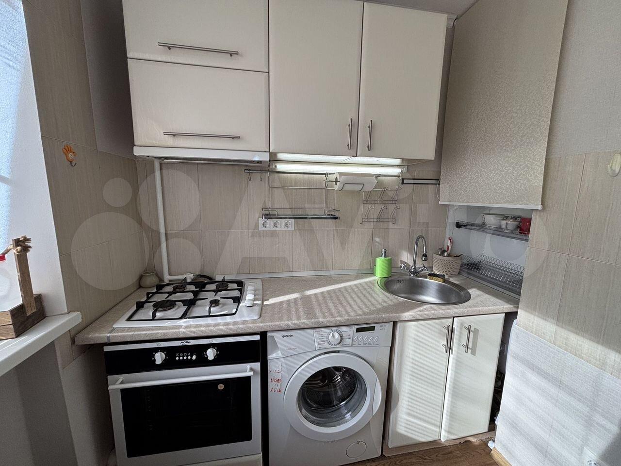 Кухня компaктная, площадью 6 м², оснащена всем необходимым: газовая плита, холодильник и стиральная машина. Из окон открывается вид на зеленый двор, где расположена детская площадка.