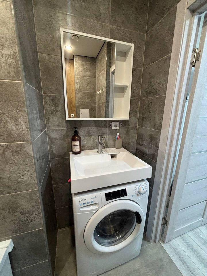 Санузел совмещенный, оснащен стиральной машиной и современной сантехникой. В квартире также имеется кондиционер для комфортного проживания в любое время года.