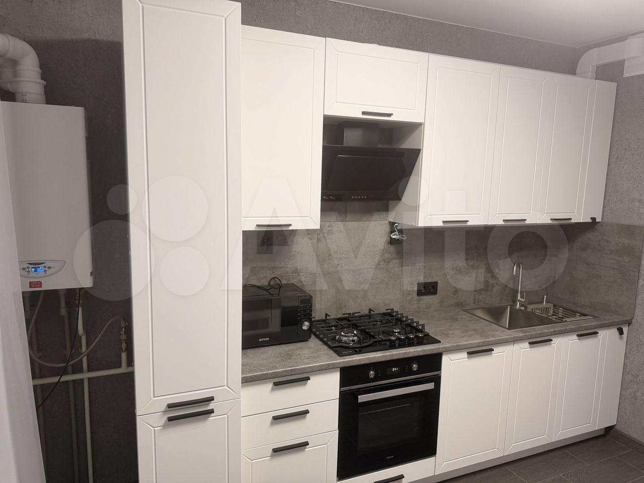 Кухня оборудована всем необходимым: есть холодильник, варочная панель, духовой шкаф, новая вытяжка и новая стиральная машина. Здесь также предусмотрены удобные шкафы для хранения.