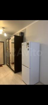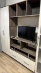 В комнате встроенная мебель, делали под заказ,вс удобно, под рукой; много мест хранения, диван раскладной, зона кухни со своей раковиной, холодильник, сплит, микроволновка, стиралка.