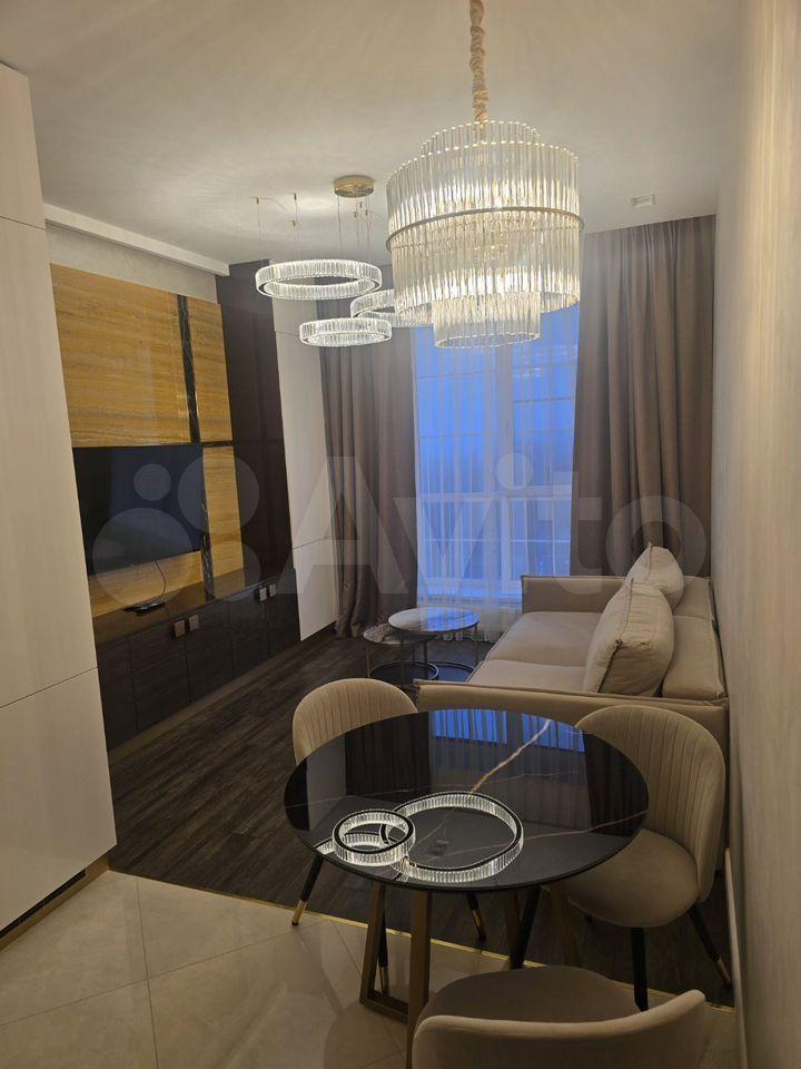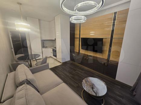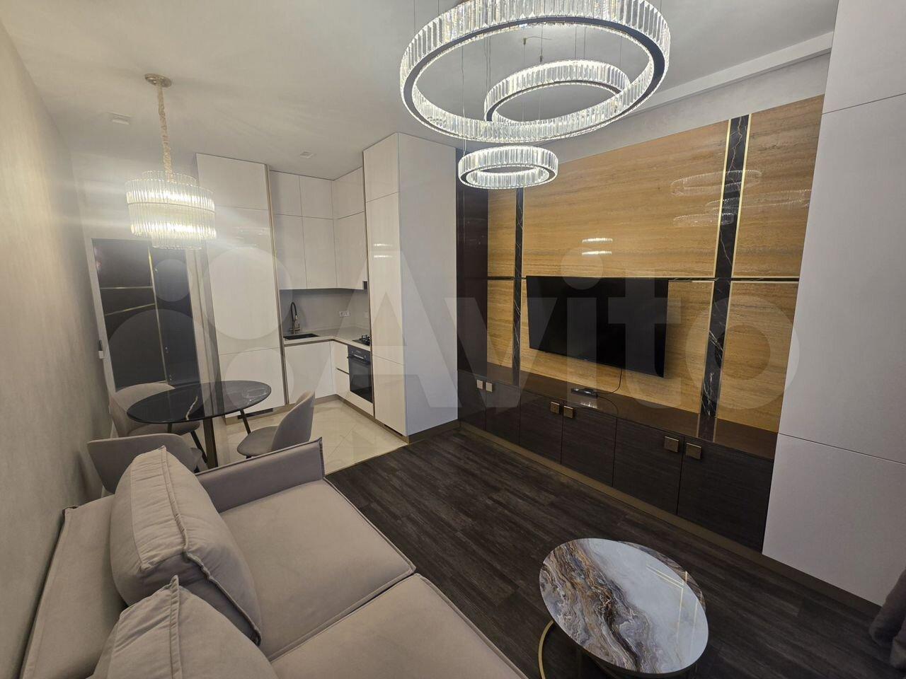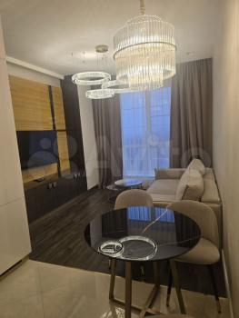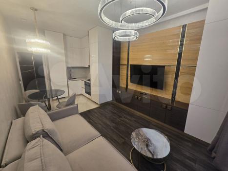 Квартира со свободной планировкой, есть отдельная гардеробная комната, шкаф купе при входе. Квартира разделена на зоны - кухня-гостиная с барной стойкой, телевизор и тв, зона сна - кровати - к ней можно повернуть тв.