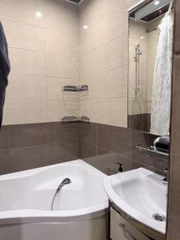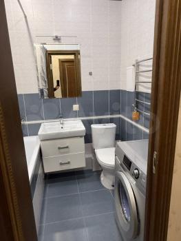 Ванная комната выполнена в современном стиле с качественной сантехникой. Из мебели — вместительные шкафы и удобный диван. В прихожей предусмотрены удобные полки для хранения вещей.