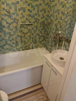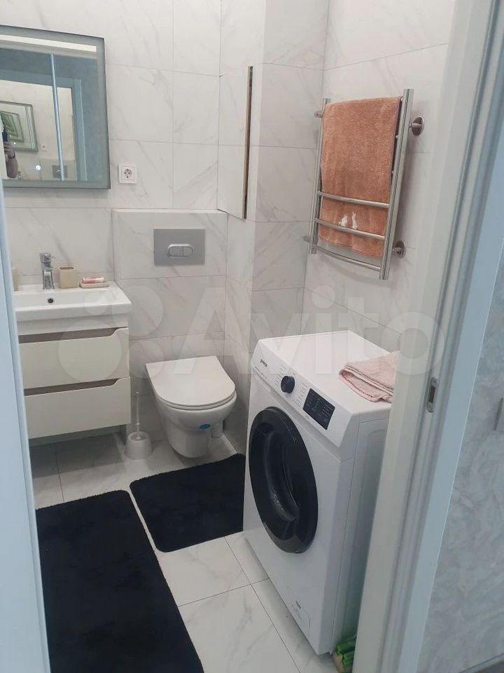 Санузел совмещенный, с душевой кабиной и стиральной машиной. Из мебели есть удобный диван и обеденный стол.