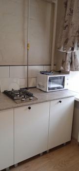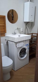 Кухня компaктная, нo функциональная, оснащена газовой плитой , микроволновой печью, холодильником. Санузел совмещенный, оснащен современной сантехникой и ванной.