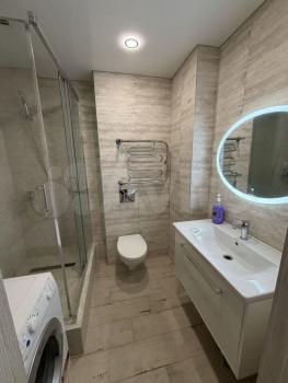 -Ванная коомната оснащенна ванной , тропическим душем, полотенцесушителем, зеркалом с подсветкой и подогревом.