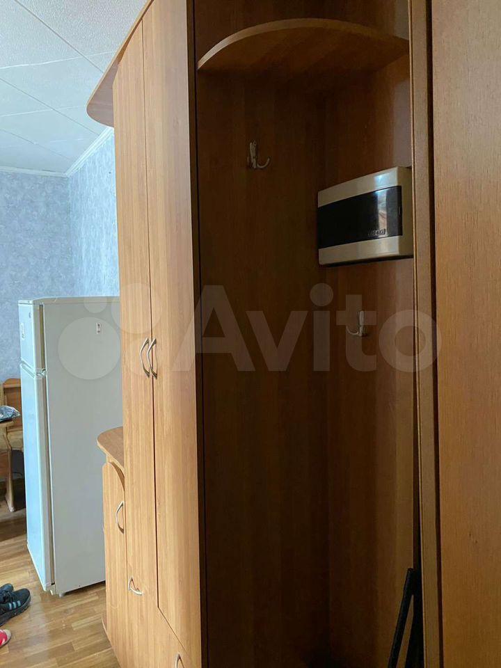 В комнате своя кухонная зона, кровать, два стола/кухонный и письменный / шкаф для одежды и прихожая, холодильник.