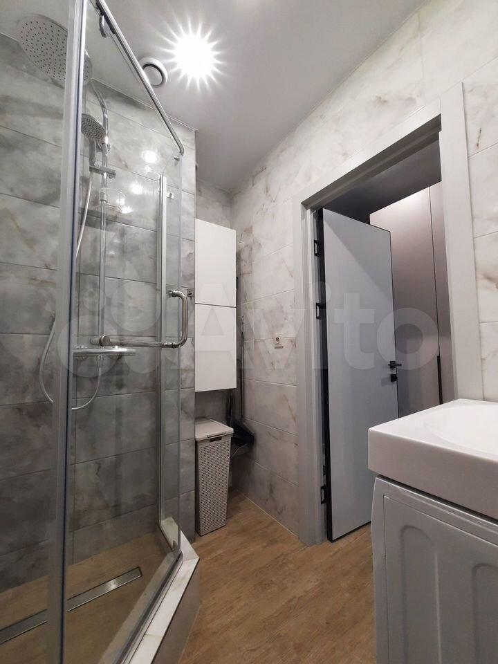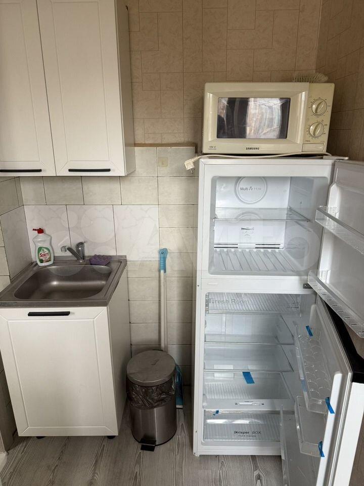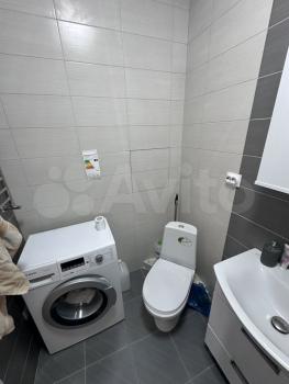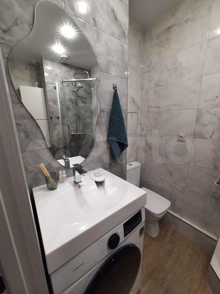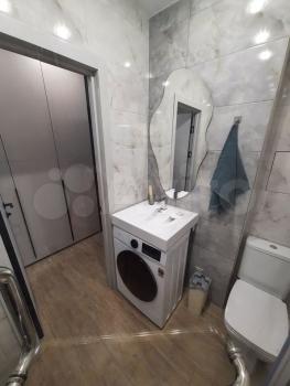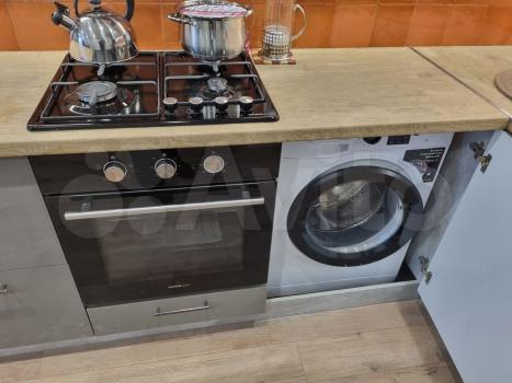 Куxня оснащена cовременной бытовой техникой, включая холодильник и плиту. Ванная комната совмещенная, с установленной стиральной машиной. Из мебели также имеются вместительные шкафы.