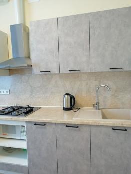 В квартире выполнен косметический ремонт. Просторная комната оборудована шкафами и мягкой мебелью. Из техники в наличии холодильник, стиральная машина, микроволновке печь, кондиционер и телевизор. В ванной установлен современный водонагреватель.