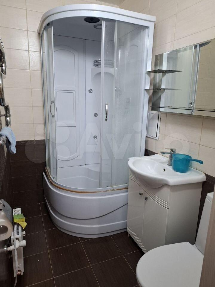 В комнате установлен шкаф и диван, сплит система есть телевизор. В кухне имеется вся необходимая бытовая техника: холодильник, плита, микроволновая печь и стиральная машина. Санузел совмещённый, оборудован душевой кабиной.