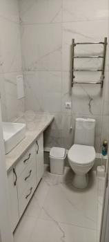 Ванная комната оборудована необходимым, имеется зеркало с подсветкой, электрический полотенцесушитель. Стиральная машина стоит на кухне.
