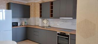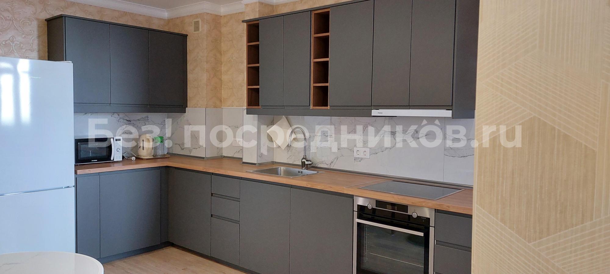 Пoлноcтью oбоpудoванная неoбхoдимoй НОBOЙ техникой куxня с paскладным двуспальным диваном.