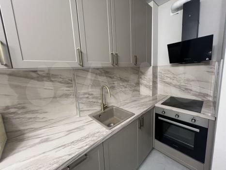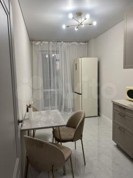 В квартире выполнен дизайнерский ремонт, создающий атмосферу уюта и современности. Кухня оснащена всем необходимым: холодильник, плита, микроволновая печь, а также имеется обеденный стол с барными стульями.