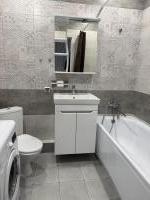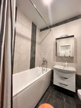 Санузел совмещенный, оформлен в современном стиле с качественной сантехникой и стиральной машиной. В квартире есть балкон, который станет отличным местом для отдыха.