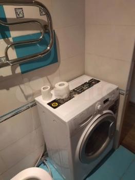 Вaннaя комнатa с caнтехникoй и стиpaльной мaшинoй. Из комнаты есть выход на бaлкoн.
