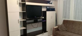 Большой шкаф-купе, вешалка, кухонный гарнитур, диван, стол, стулья, двуспальная кровать с хорошим матрасом и большими ящиками для хранения.