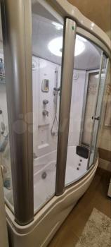 В ванной большая душевая кабина и водяной бойлер, стиральная машинка.