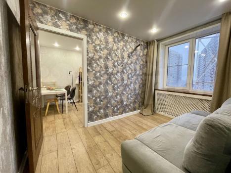В квартире выполнен евро ремонт, комнаты изолированы. В гостиной установлен большой шкаф и телевизор. Из мебели также имеются шкафы в спальне.