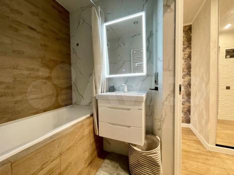 Санузел совмещенный, оборудован душевой кабиной и стильной сантехникой. Балкон застеклен, с него открывается вид на городские пейзажи.