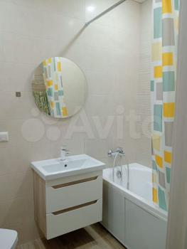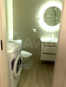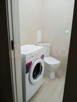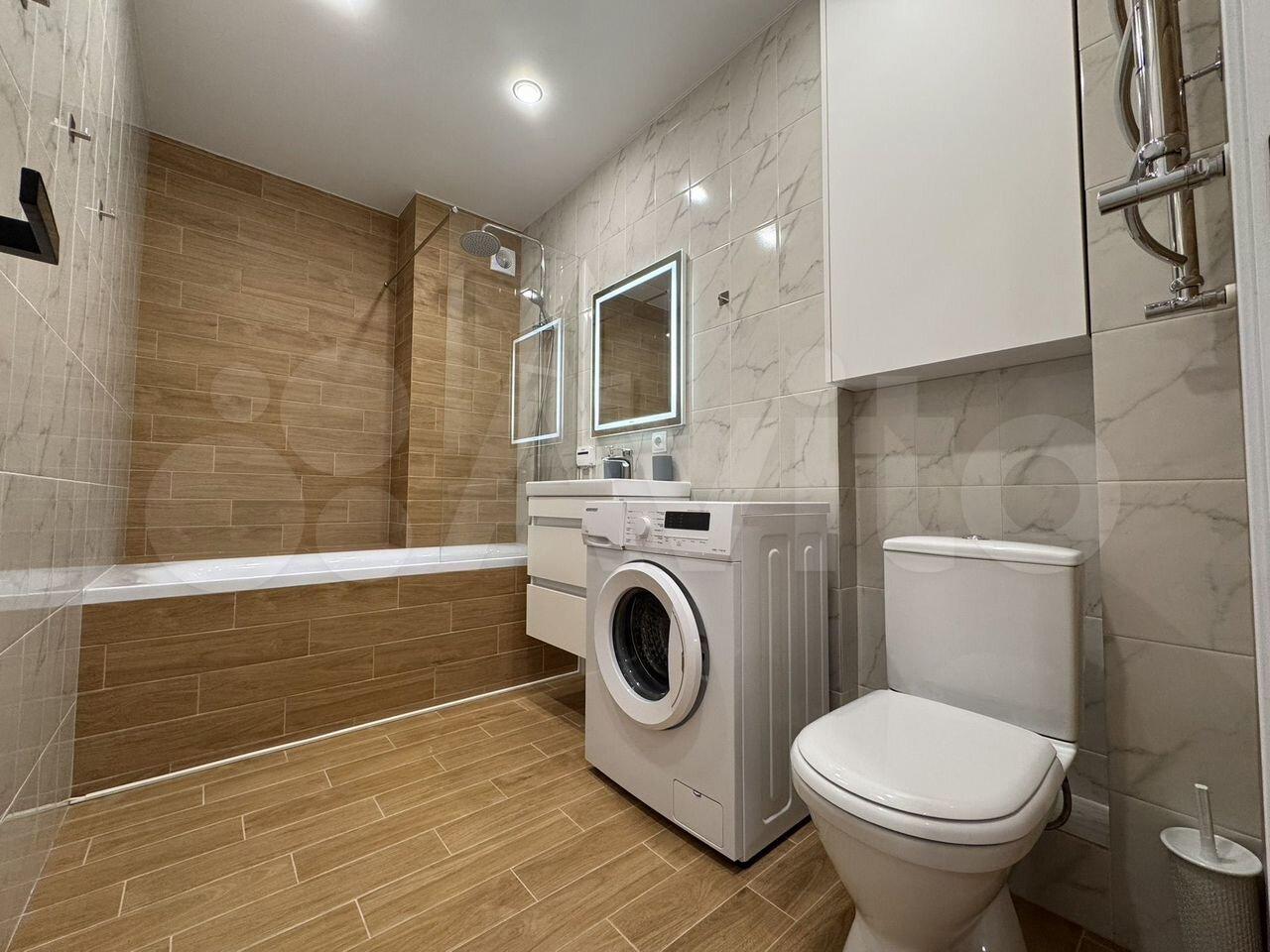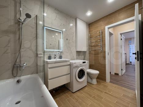 Санузел совмещенный, оформлен в светлых тонах, оснащен ванной и стиральной машиной. В квартире есть два кондиционера и два телевизора.