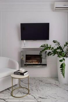 • Центральная стена с камином делит гостиную и спальню. Большая двухспальная кровать (под кроватью имеются ящики для хранения), шкаф-купе с зеркалами в полный рост.