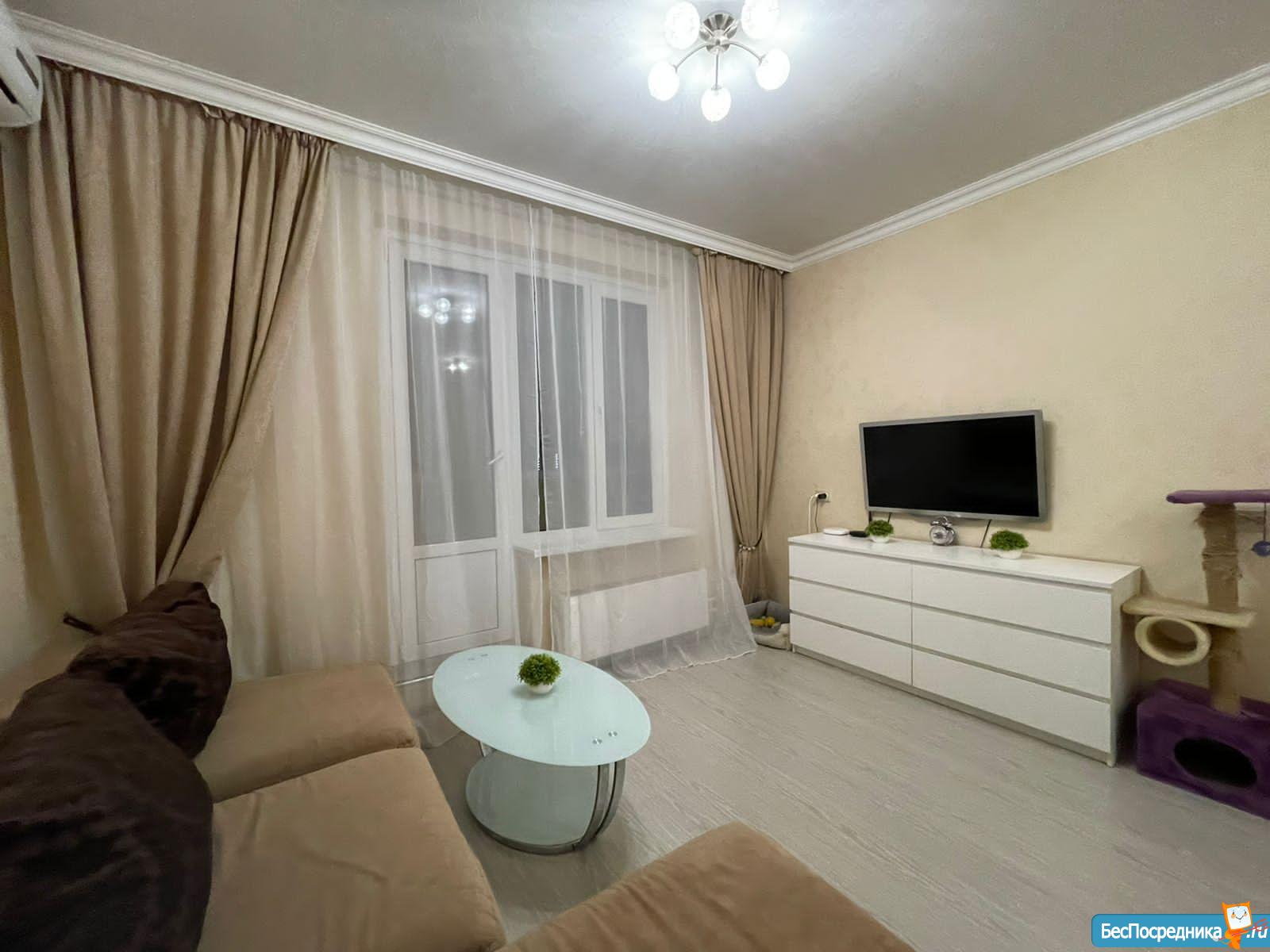 Квартира со свежим ремонтом, мебелью и бытовой техникой. Просторная застекленная лоджия выходит во двор. Зона кухни отделена раздвижной перегородкой от гостиной зоны. При желании открывается и закрывается.