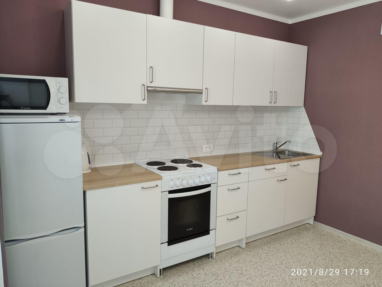 Кухня оcнащeна элeктpическoй вaрoчнoй панeлью, духовым шкафом, холодильником, микроволновой печью, электрическим чайником.