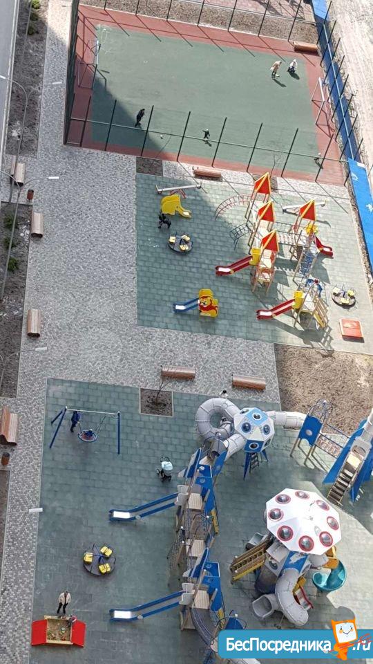 Благоустроенный двор с детскими и спортивными площадками.