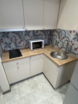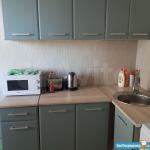 - Кухонная зона: электрическая плита, холодильник, СВЧ, чайник, посуда.