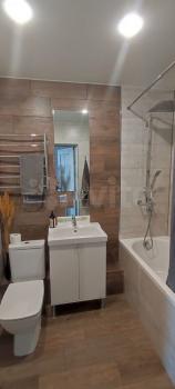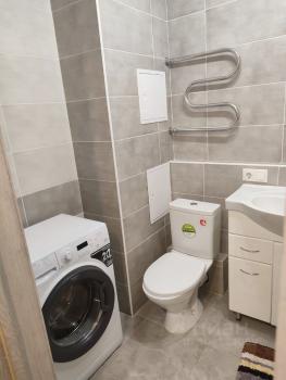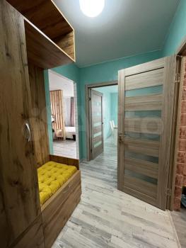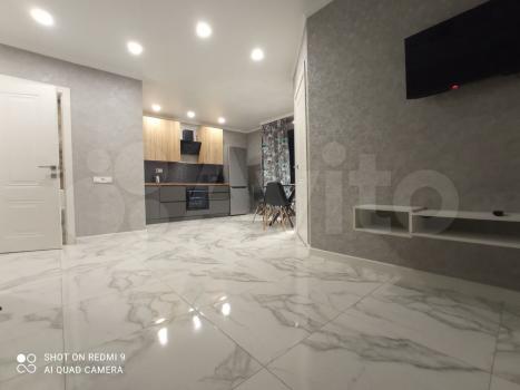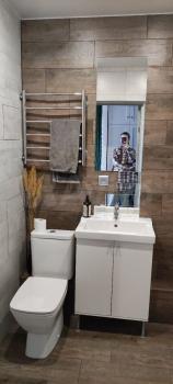 Хороший ремонт. Окна пластиковые, на полу качественный ламинат, квартира светлая и уютная. Натяжные потолки, в санузле керамическая плитка. Вай-фай. Завтра утром дособираю шкаф и добавлю ещё фото.