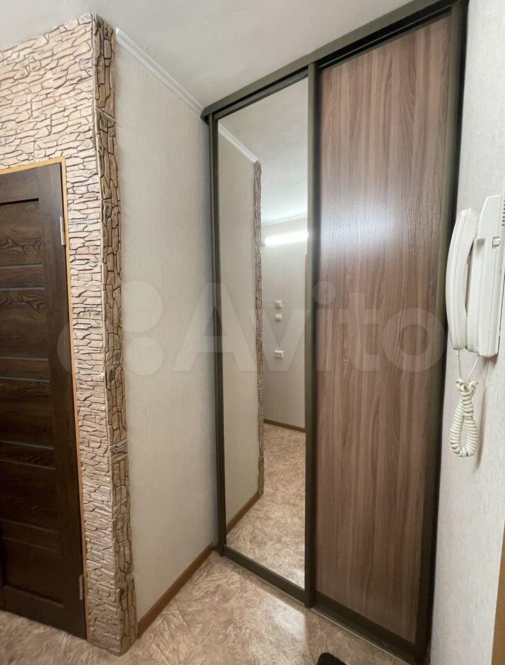 В коридоре большой шкаф-купе в потолок с зеркалом и местами хранения.