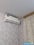 В комнате установлена современная мебель: удобный диван и шкафы. Из техники имеется холодильник и стиральная машина. В гостиной установлен кондиционер для поддержания комфортной температуры воздуха.