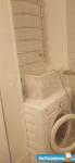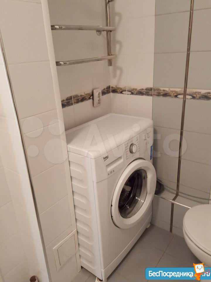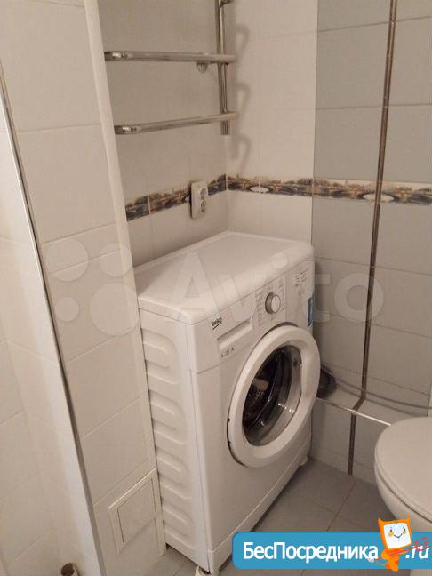 Санузел совмещенный, оснащен ванной и стиральной машиной. Балкон застеклен, что позволяет использовать его как дополнительное пространство для хранения.