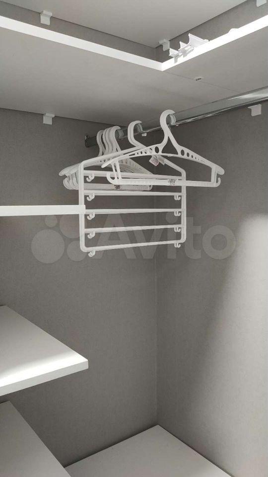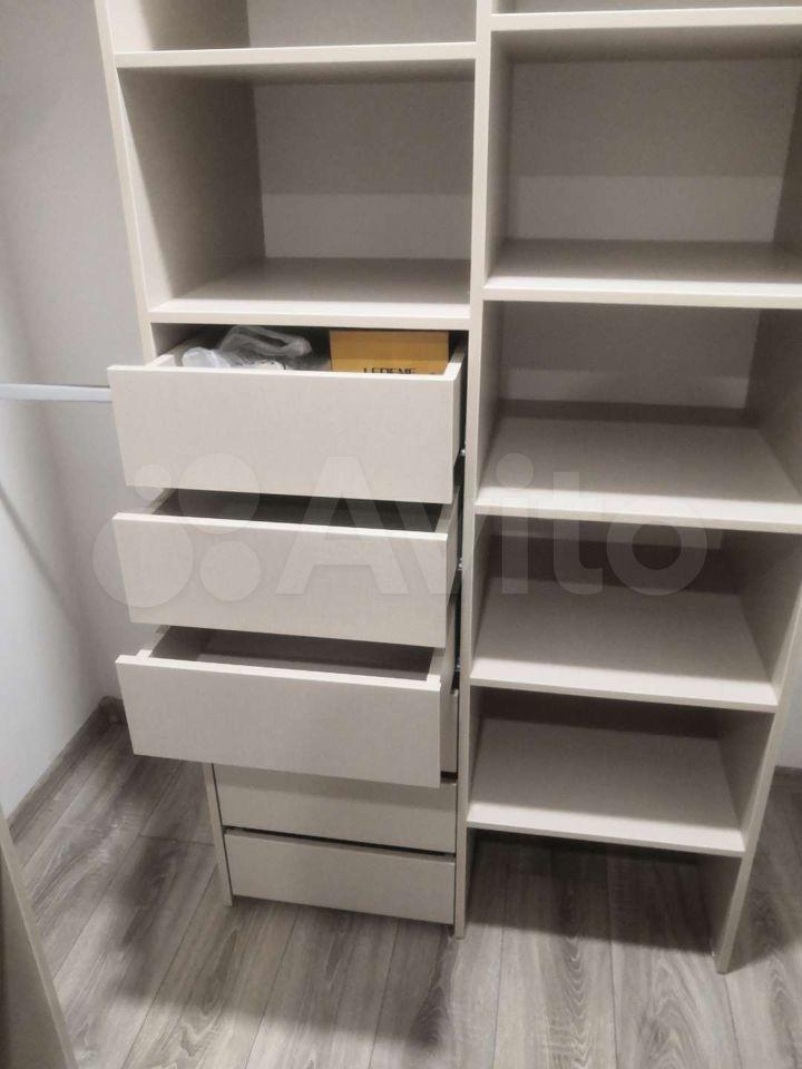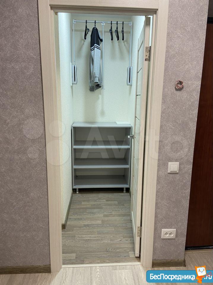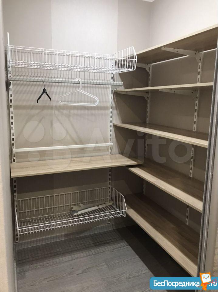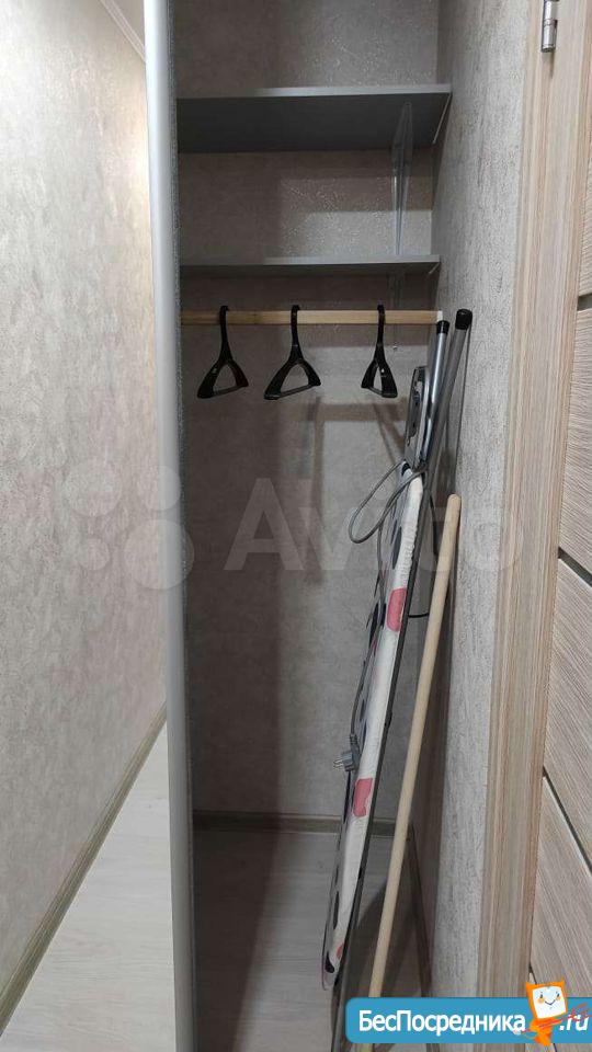 В прихожей огромный зеркальный шкаф-купе с хорошей вместимостью, с полками и ящиками под хранение.