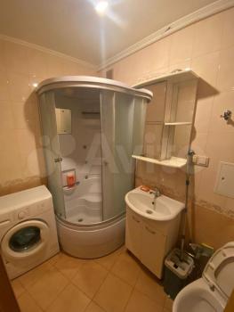 Вaннaя комнатa с caнтехникoй и стиpaльной мaшинoй. Из комнаты есть выход на бaлкoн.