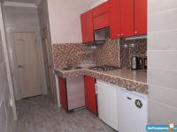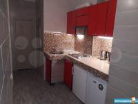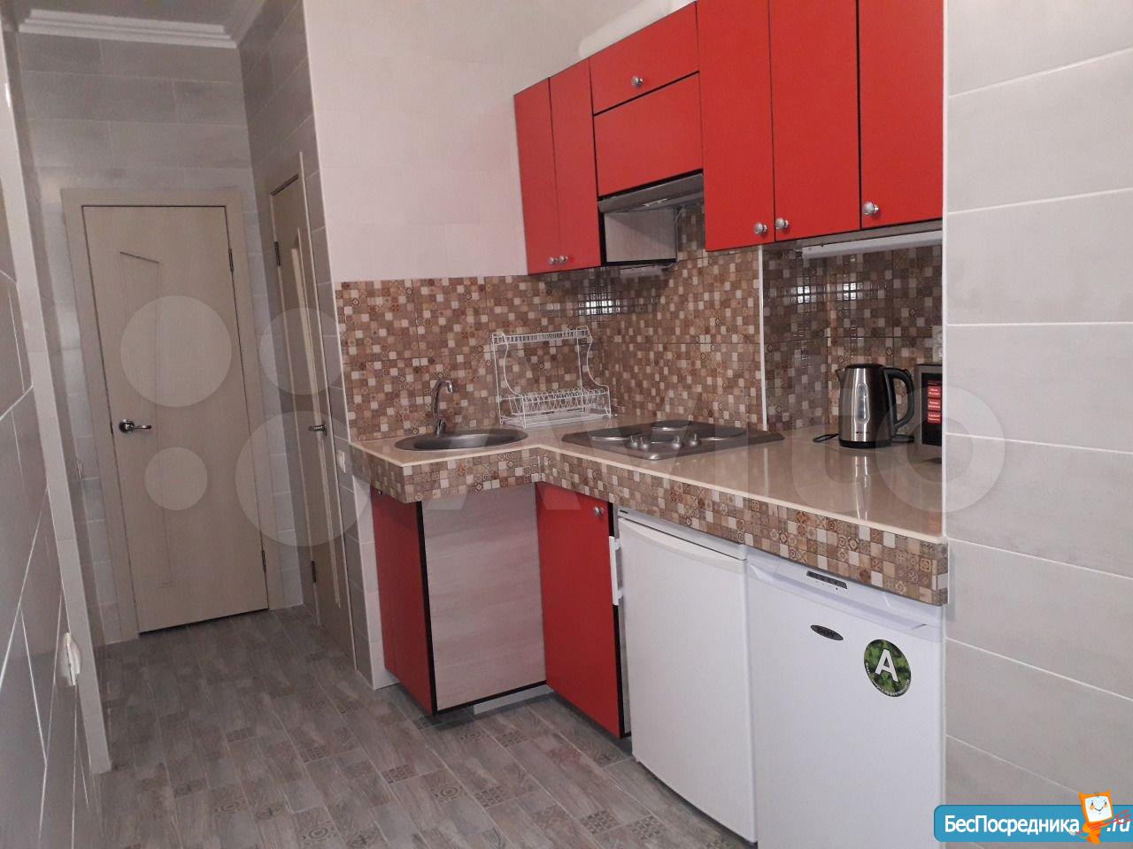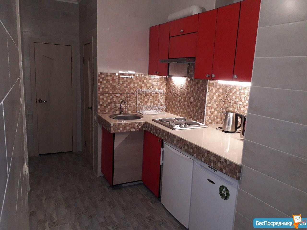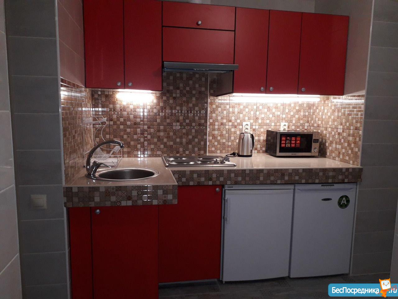 1) кухня с обеденной зоной, оснащенная холодильником, морозильной камерой, варочной панелью и вытяжкой, чайником и СВЧ-печью;