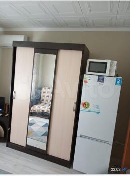 Раскладной диван, большой шкаф, холодильник, стол, кухня, микроволновка,