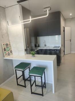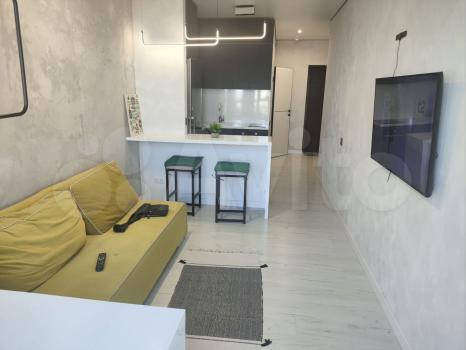 Квартира имеет дизайнерский ремонт и полностью обставлена современной мебелью, как в комнате, так и на кухне. В наличии вся необходимая техника: кондиционер, холодильник, телевизор и стиральная машина. В ванной комнате установлена ванна, что добавляет комфорта. Приятным бонусом будет наличие интернета, что идеально подходит для работы и отдыха.