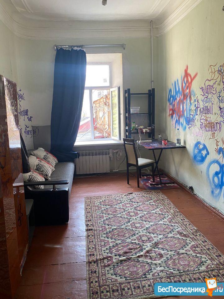 Комната 18,4 м, в самом центре около РИНХа, в комнате есть вайфай, утюг, набор посуды,сменное постельное. Главные недочеты: комната разрисована и ремонт довольно старый. На общей кухне стоит свой шкаф.