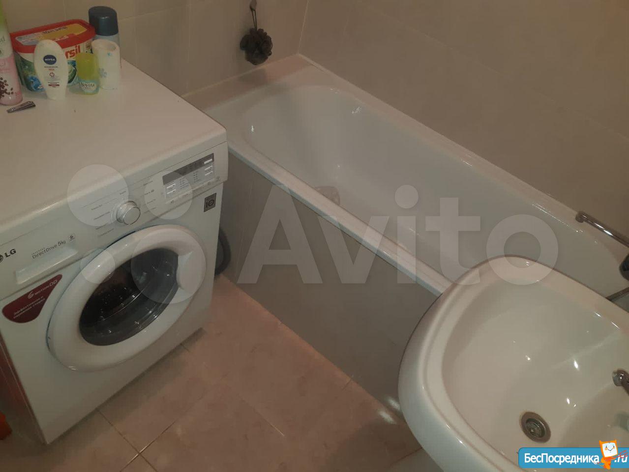 Ванная комната оборудованна всем необходимым, унитаз, ванна, зеркало и шкаф под раковину, полотенцесушитель, стиральная машина Ariston.