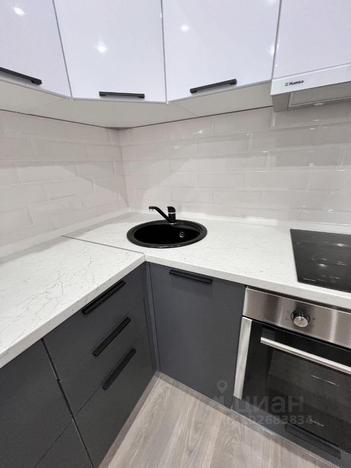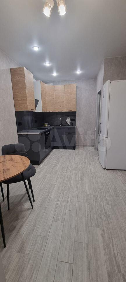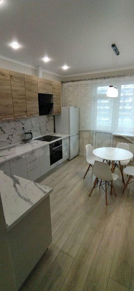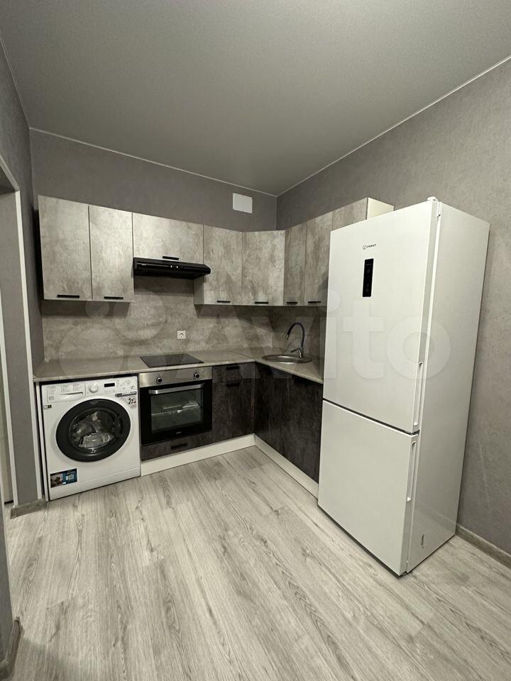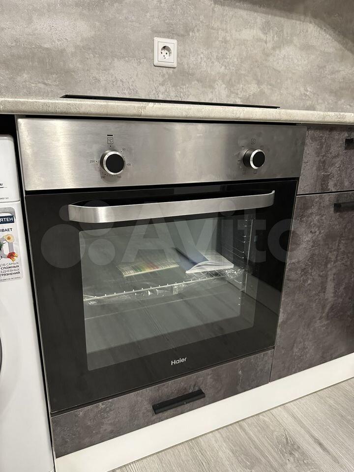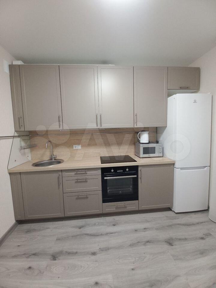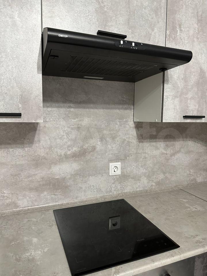 Кухня оборудована (варочная панель, духовой шкаф, вытяжка, холодильник).