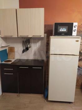 В комнате своя кухонная зона, кровать, два стола/кухонный и письменный / шкаф для одежды и прихожая, холодильник.