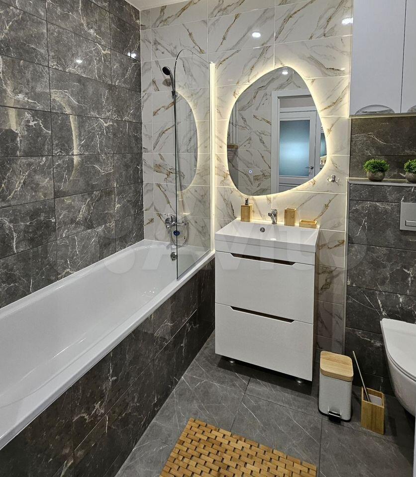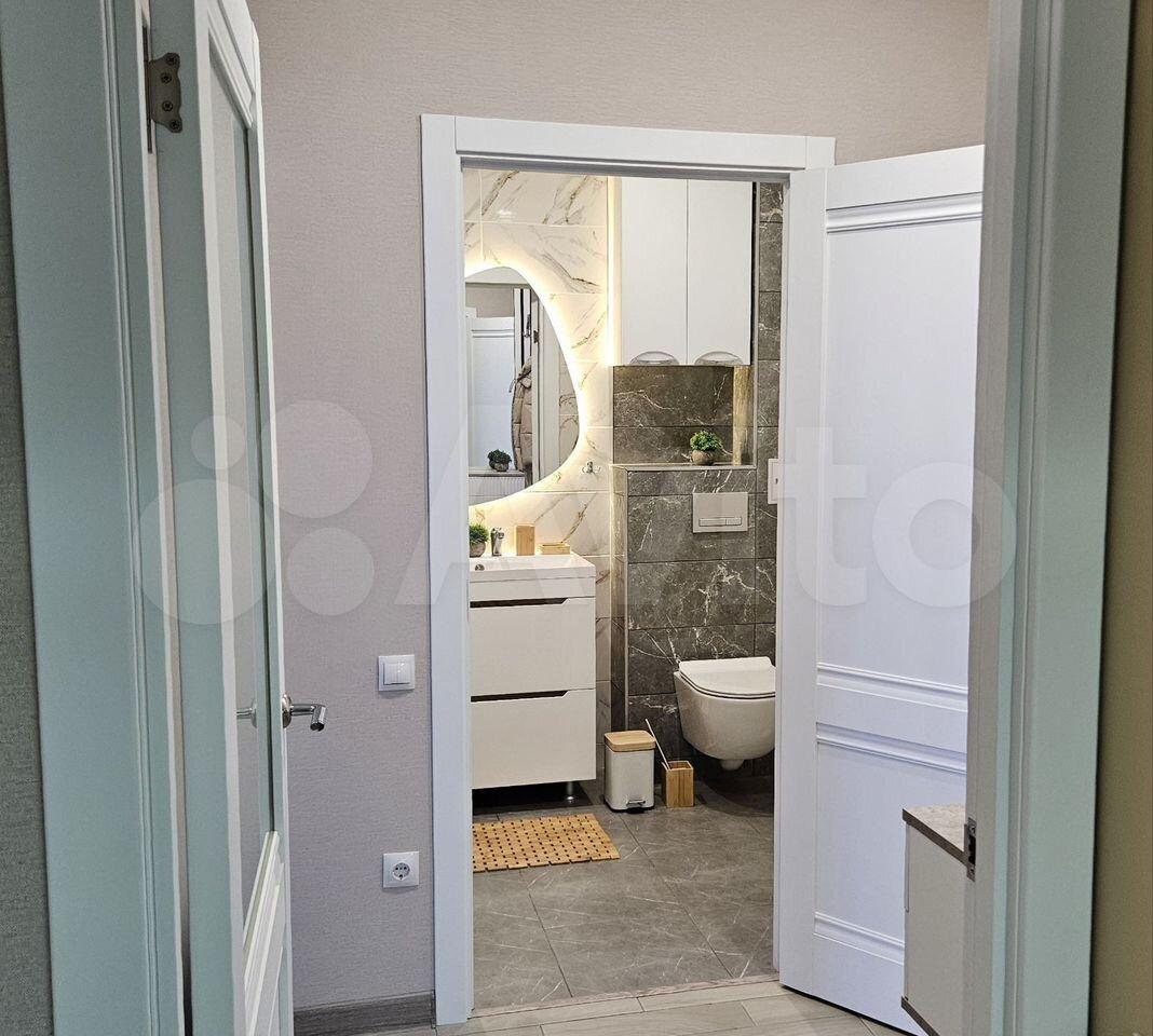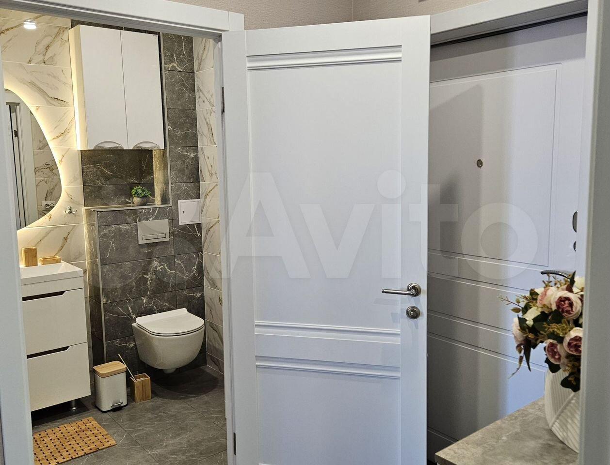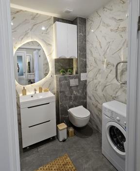 Ванная комната совмещенная, оформлена в стильном мраморном стиле. В прихожей предусмотрены удобные шкафы для хранения вещей. Из окон открывается приятный вид на двор с открытой парковкой.