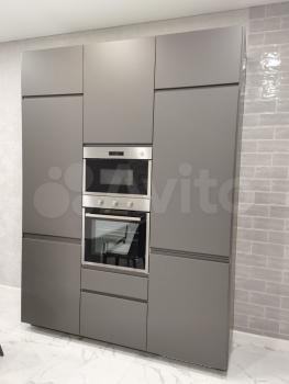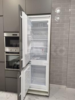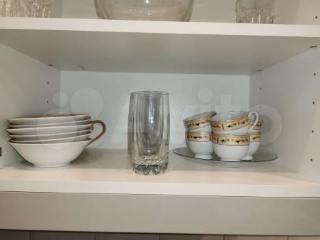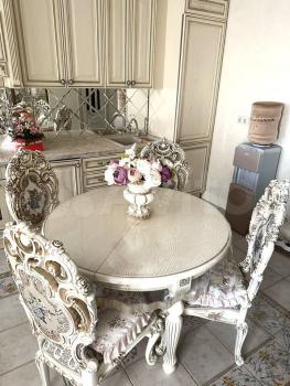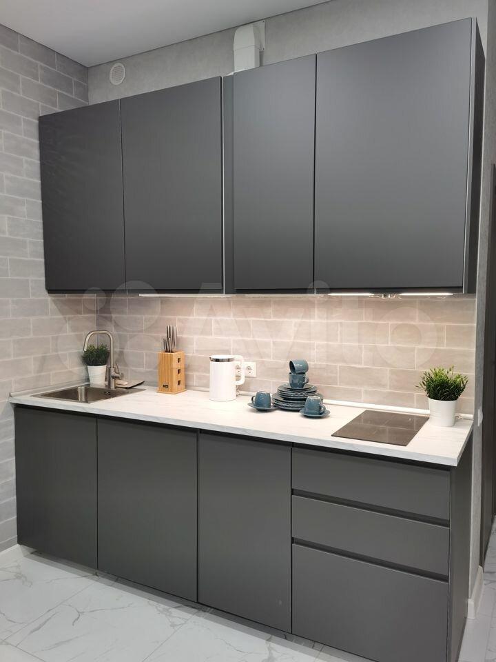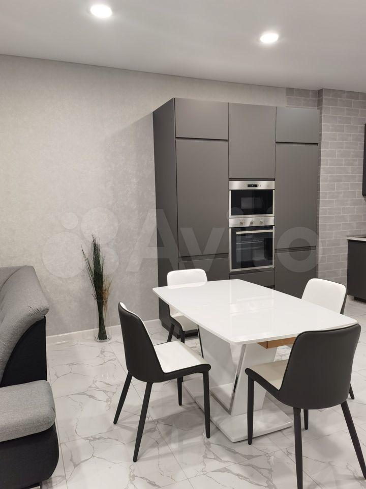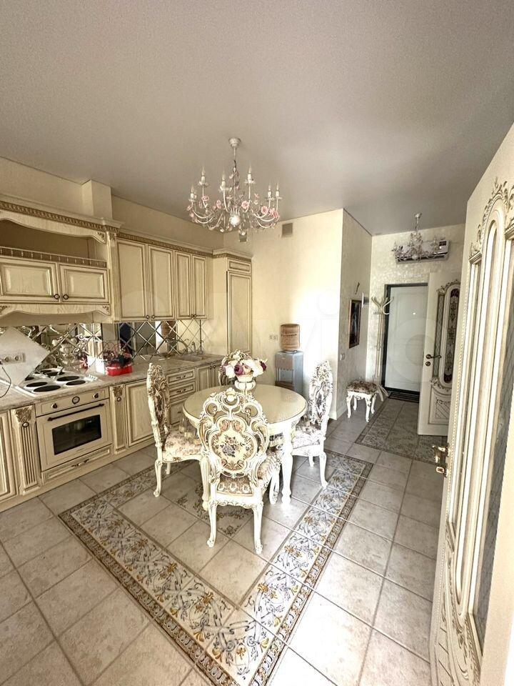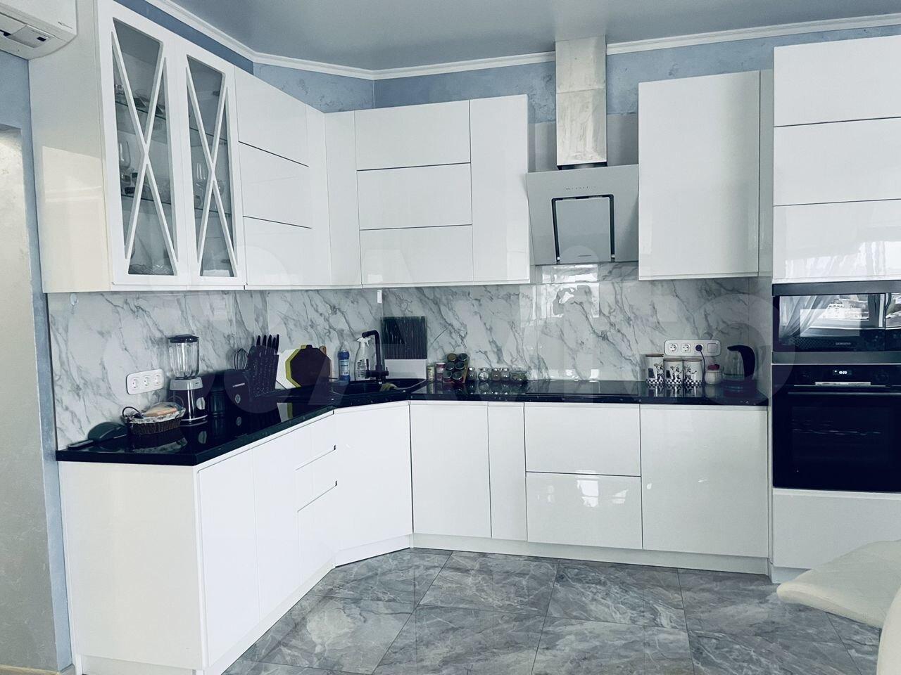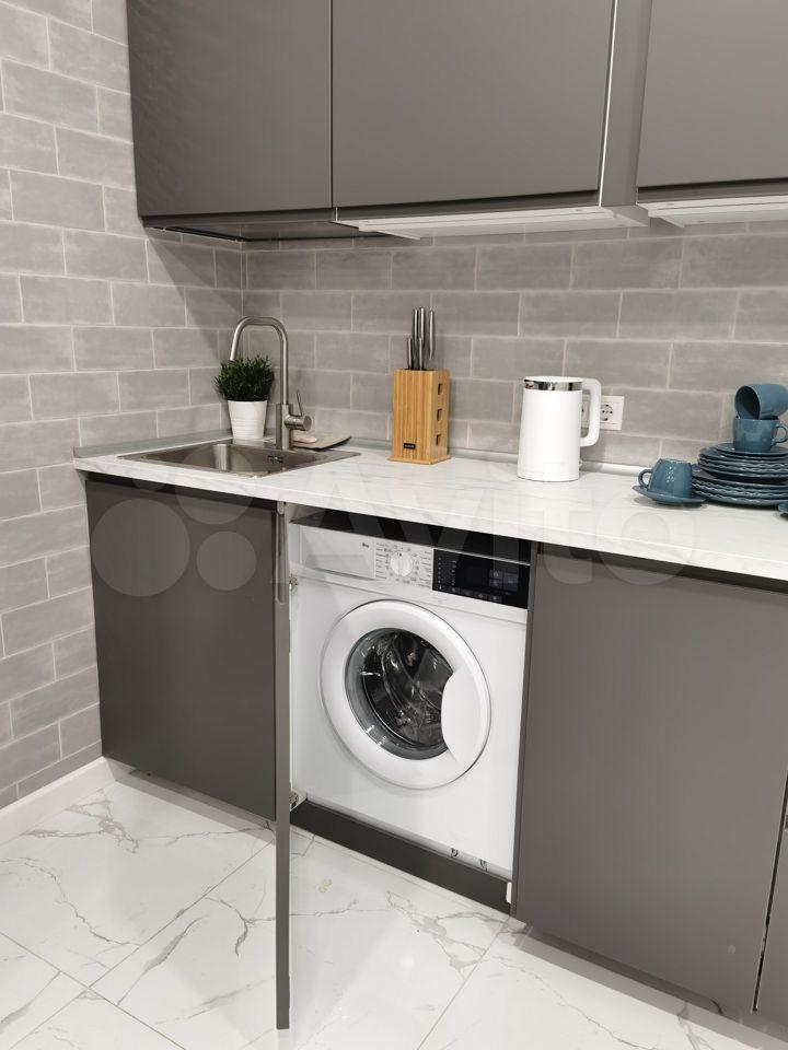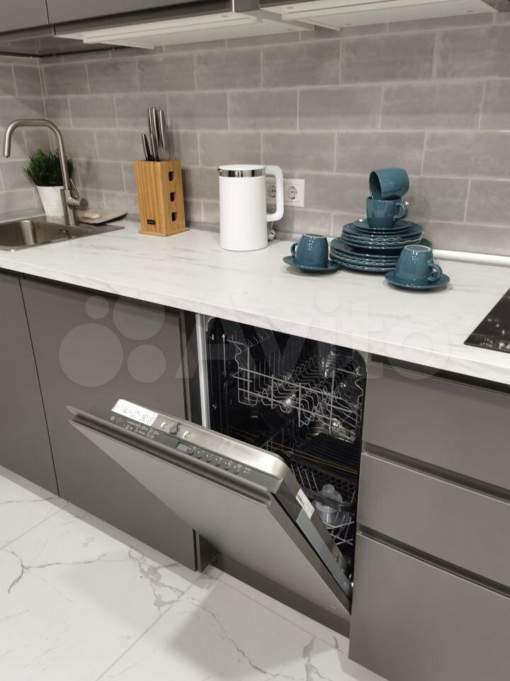 3) Кухня-гостиная поделена на две зоны: для приготовления еды и отдыха. На кухне есть вся необходимая техника: вытяжка, варочная панель, встроенный холодильник, духовой шкаф, СВЧ, посудомоечная машина, стиральная машина с функцией сушки, фильтр для воды и места для хранения.