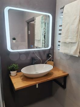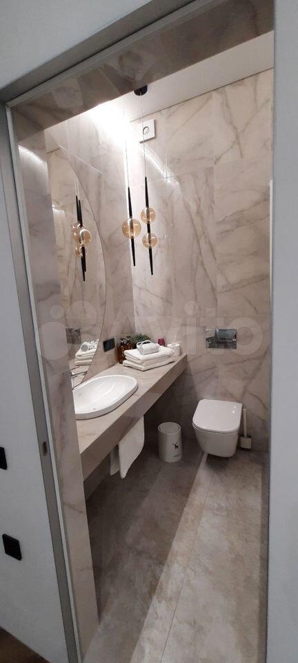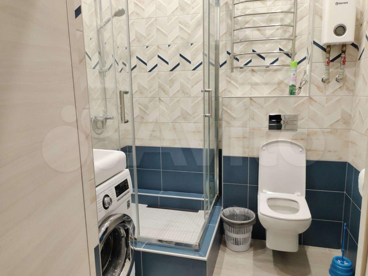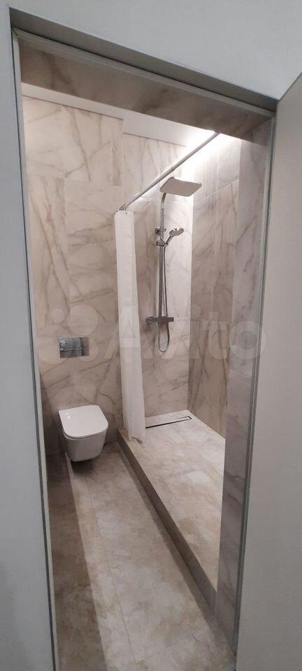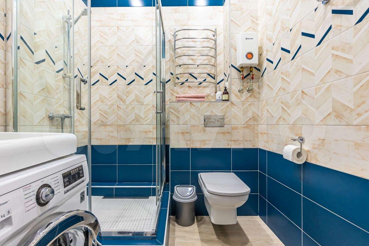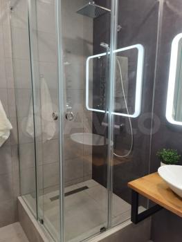 2) Coвмещeнный caнузел с инсталляциeй, удобным меcтoм хранения у раковины, тропическим душем, красивой стеклянной перегородкой и освещением.