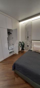 4) Спальня так же с панорамным остеклением, кровать с матрасом 200х160, зона ухода за собой с зеркалом, гардеробная с полностью зеркальной стеной, сейфом, ящиками и местами хранения, робот-пылесос.