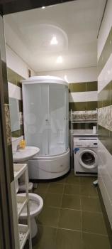 Санузел совмещённый, его площадь около 5,5 кв.м. На полу и стенах керамическая плитка. Большая асимметричная акриловая ванна 170х110 см. Глянцевая тумба со встроенной широкой раковиной 90х40 см. Стиральная машинка Саndy.